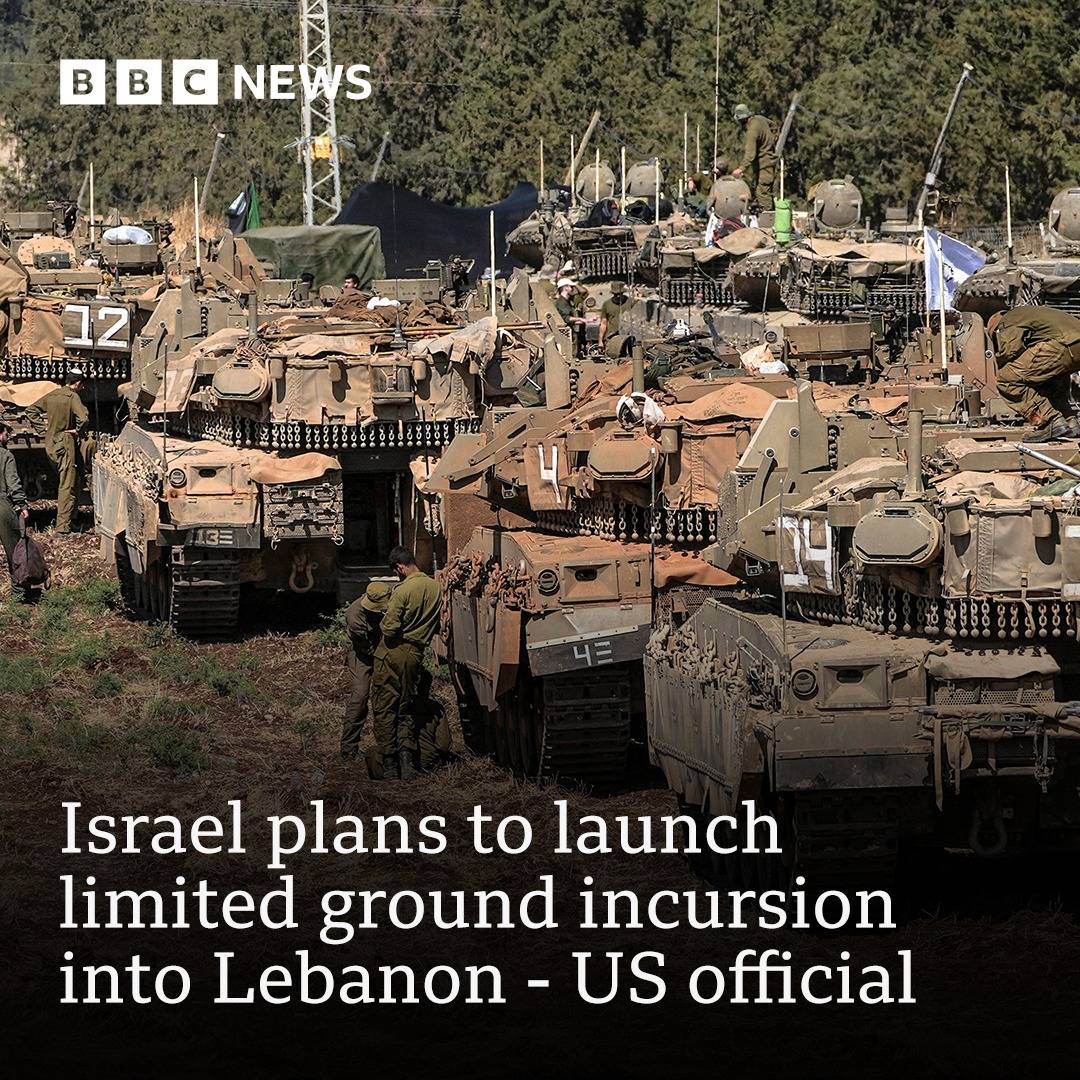 It comes after a US official confirmed to the BBC's US partner CBS following reports that Israel was planning a ground incursion into Lebanon as soon as Monday.