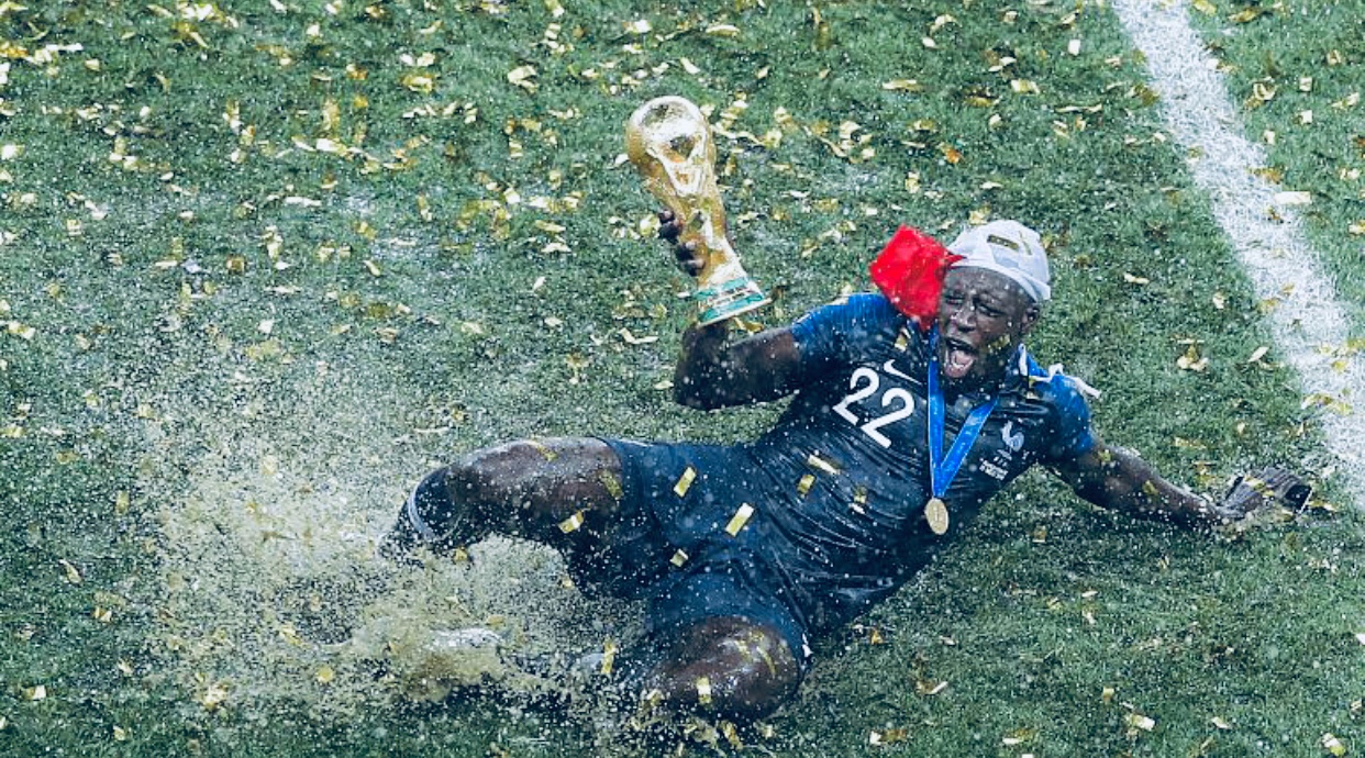 Benjamin Mendy of France celebrates with the trophy after his team defeated Croatia in the 2018 World Cup final in Moscow, Russia, on July 15, 2018.