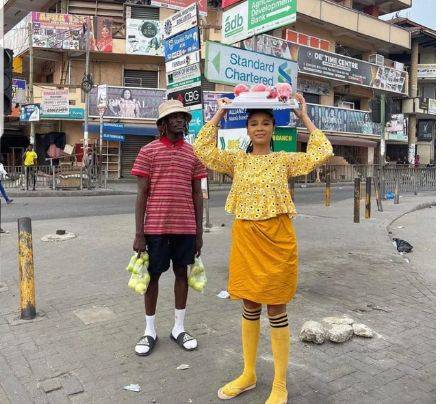 She was in the company of hip-hop artiste Kofi Mole who was also hawking apples.