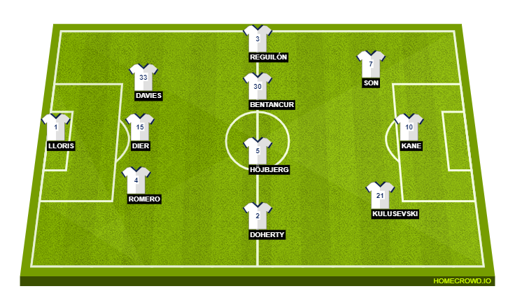 Lloris; Romero, Dier, Davies; Doherty, Hojbjerg, Bentancur, Reguilon; Kulusevski, Kane, Son; Kulusevski, Kane, Son