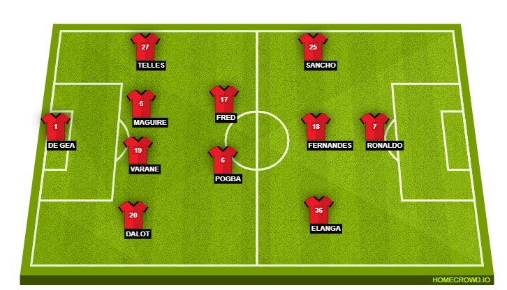 De Gea; Dalot, Varane, Maguire, Telles; Pogba, Fred; Elanga, Fernandes, Sancho; Ronaldo (4-2-3-1)