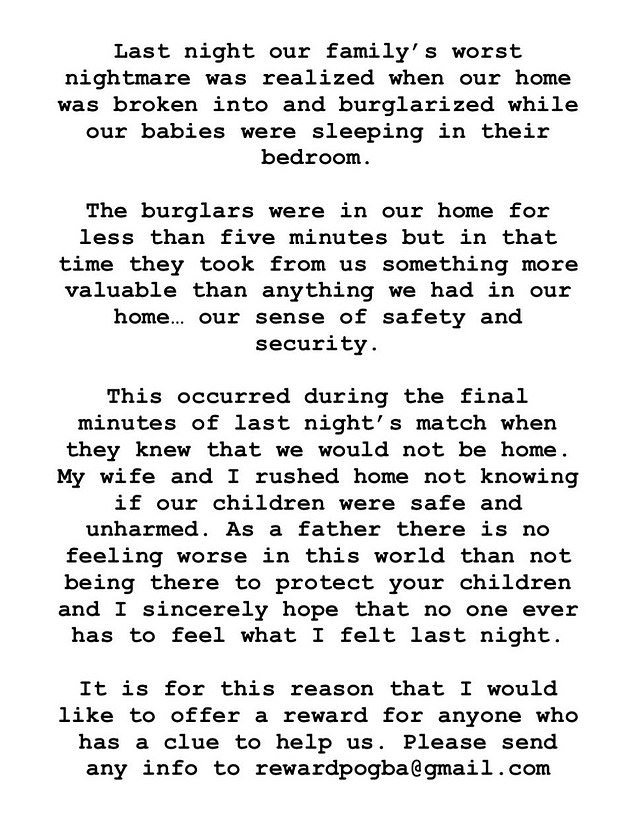 During Manchester United's Champions League defeat by Atletico Madrid, Paul Pogba's house was burgled while his CHILDREN were at home, as shaken as he is. The France star is offering a reward to anyone who can provide information about the five-minute raid.