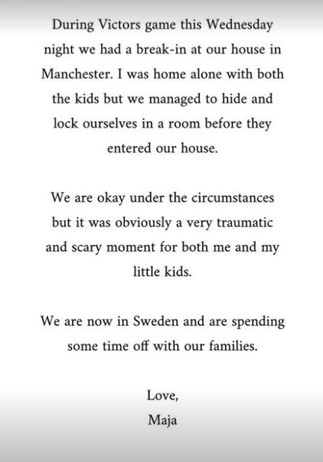 'We had a break-in at our house in Manchester during Victor's game this Wednesday night,' she said on Instagram.
