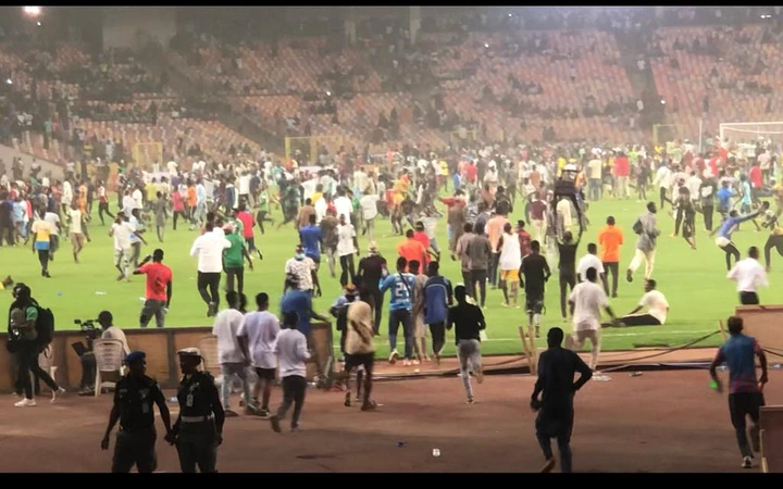 Chaos broke up soon after the referee whistled to end the 95 minutes of play between Ghana and Nigeria in Abuja last Tuesday. According to one TV presenter, Nigerian supporters who were disappointed in their team invaded the pitch throwing bottles and other objects onto the pitch. He said the technical bench for the Super Eagles was destroyed and the team had to ran for their lives.