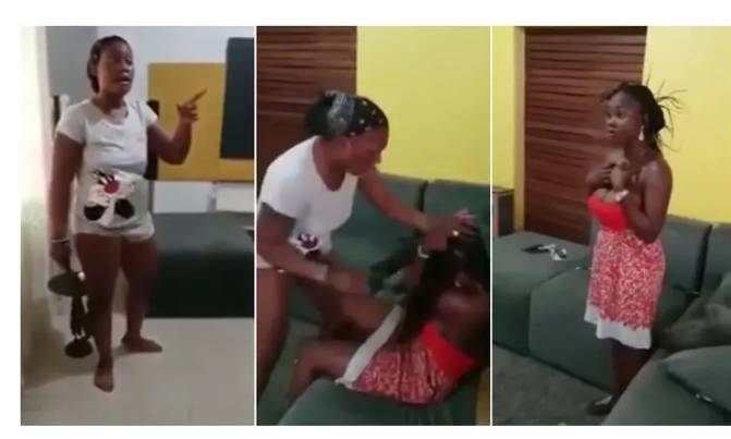 The wife could be seen striking the side chick with a belt while another lady stood behind the camera, according to the footage.