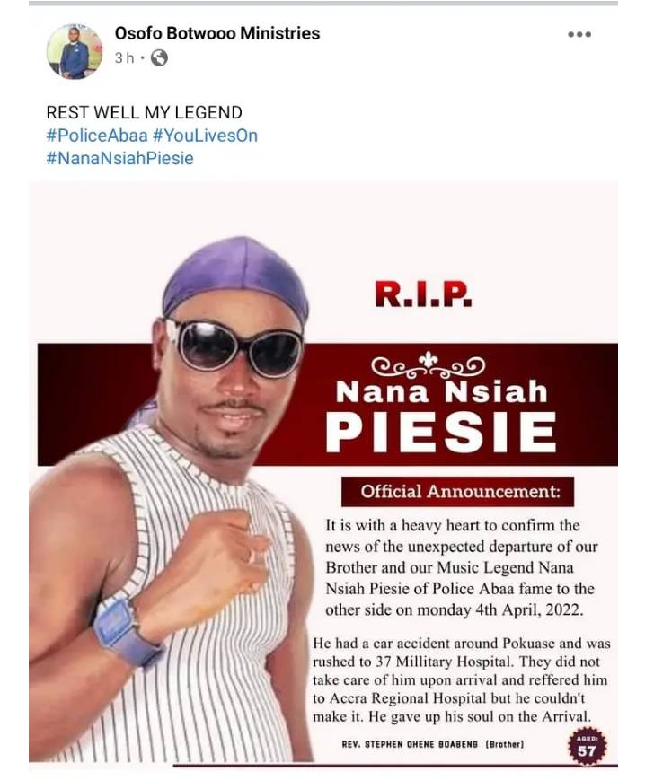 The musician's brother, Osofo Botwoo, said on Facebook, "It is with a sorrowful heart to confirm the news of our brother and our music great Nana Nsiah Piesie of Police Abaa fame's untimely death to the other side on Monday 4th April, 2022."