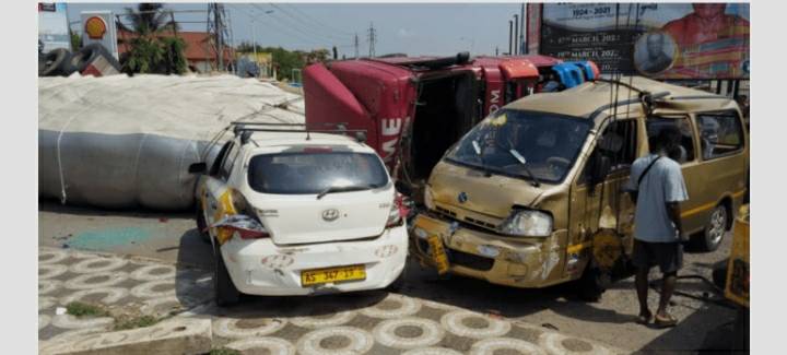 An eyewitness says, the trailer car with Registration number AE - 354 - 12 expected of failed brake. The driver saw this and decided to hit the car at the round about to save life after he tried to stop and was not stopping. Upon hitting the round about, the Trotro and the taxi driver also decided to pass quickly which they couldn't do that so the bags of cashews fell on them.