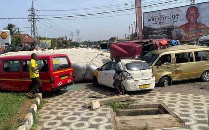 A trailer filled with sacks of cashew crashed on the cars at the Airport Roundabout in Kumasi, injuring some people on board a compact commercial 'trotro' bus and a taxi cab.