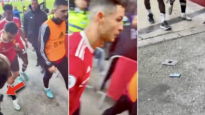 As he storms down the tunnel at Goodison Park, Ronaldo appears to smash a supporter's outstretched phone into the tarmac, according to a video posted on Twitter. Ronaldo can be seen stomping down the tunnel with a shin pad in his left hand, while his right hand is clenched into a fist and lashes out.