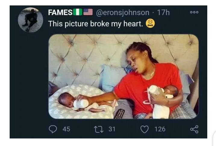 A photo of a woman returning from work appears to be quite fatigued; as a mother, she must feed her twins, and she nodded off while doing so, demonstrating how stressed and tired she was. A mother is someone who gives up everything for her child, and she is deserving of all the love and admiration in the world.