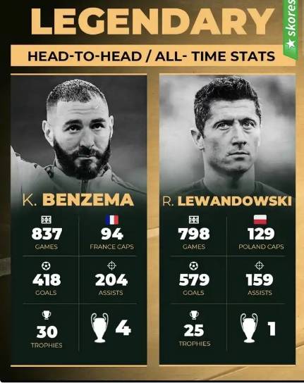 Check out Benzema and Lewandowski's achievements, trophies, and goals in a head-to-head matchup (All-Time)Karim Benzema and Robert Lewandowski h