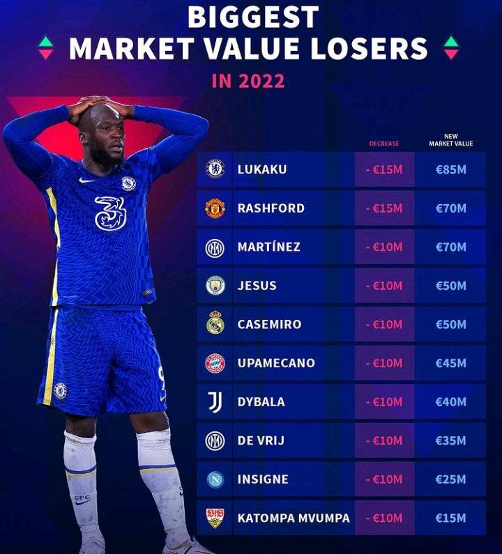 Romelu Lukaku and Marcus Rashford are the players with the largest market worth losses. Lukaku joined Chelsea for €100 million during the summer transfer window of 2021. His market value has fallen to €85 million at the moment. In the English Premier League this season, he has only scored five goals.At the start of the season, Marcus Rashford was worth €85 million. His market value has plummeted to little about €70 million. He seemed to be taking a lengthy time to recover from his surgery. In 22 Premier League matches this season, he has scored four goals and provided two assists.Lautaro Martinez is the player whose market value has dropped the most in 2022. His market value has plummeted by €10 million. Inter Milan's midfielder is worth €70 million on the open market.