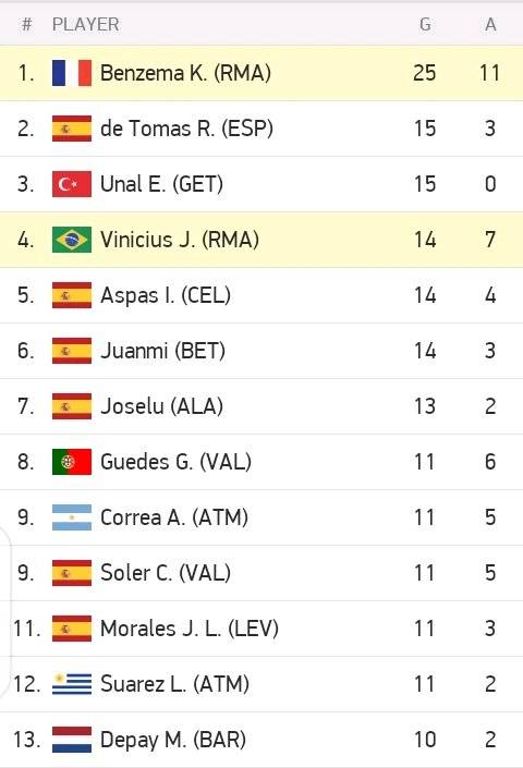 Carlo Ancelloti's side took the lead in the second half and battled their way back into contention when Rodrigo tapped home in the 50th minute, but Nacho tied the scores with a magnificent finish in the 82nd minute. The team's talisman, Karim Benzema, came through once more for the Los Blancos, hitting a magnificent goal late in stoppage time to secure the win.With his goal against Real Madrid yesterday, Karim Benzema maintained his lead in the La Liga golden boot standings with 25 goals, 10 more than second-placed Raul de Tomas. Getafe striker Enes Unal is third on the list with 15 goals, while Real Madrid striker Vinicius Junior is fourth with 14 goals. The most recent edition of the Laliga greatest scorers table is shown below.