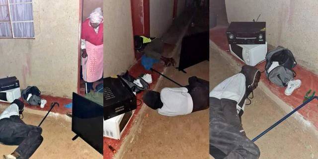The video shows the old lady's neighbors gathering to catch a glimpse of the sleeping thieves. She is seen in the footage narrating to her neighbours how the alleged burglars broke into her house to make away with her properties.