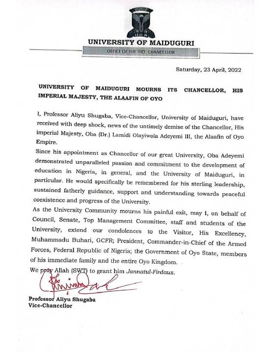I, Professor Aliyu Shugaba, Vice-Chancellor, University of Maiduguri, have received with deep shock, news of the demise of the Chancellor, His Imperial Majesty, Oba (Dr.) Lamidi Olayiwola Adeyemi Ill, the Alaafin of Oyo Empire.