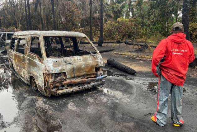 After a weekend explosion at an illicit oil refinery plant on the border of Nigeria's Rivers and Imo states that killed over 100 people, charred carcasses were left sprawled among burnt palms, vehicles, and trucks on Sunday.