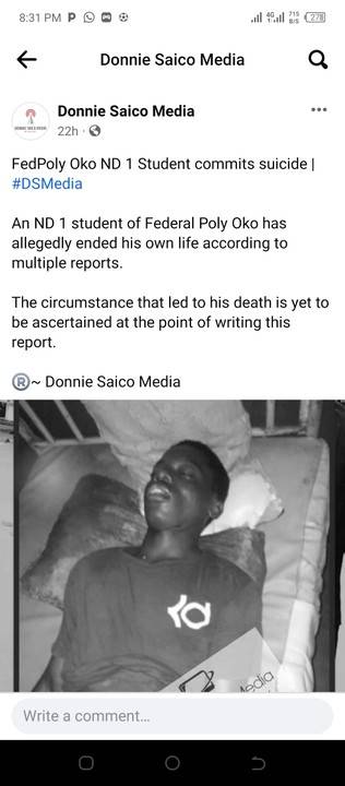 According To Reports Gathered By NaijaCover, The Male Student Who is ND 1 Level In The School, has allegedly Ended His own life.