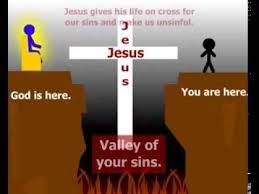 There's this drawing of man standing on one side of the deep valley. There is no way that man can get to the side where God is. In the next box is a drawing of Jesus' cross forming the bridge over the valley. In the third drawing man walks across Jesus' cross to get to God's side.