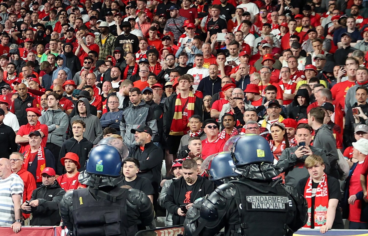 French riot police are seen stood in front of Liverpool fans during the UEFA Champions League final match between Liverpool and Real Madrid at Stade de France on May 28 2022 in Paris