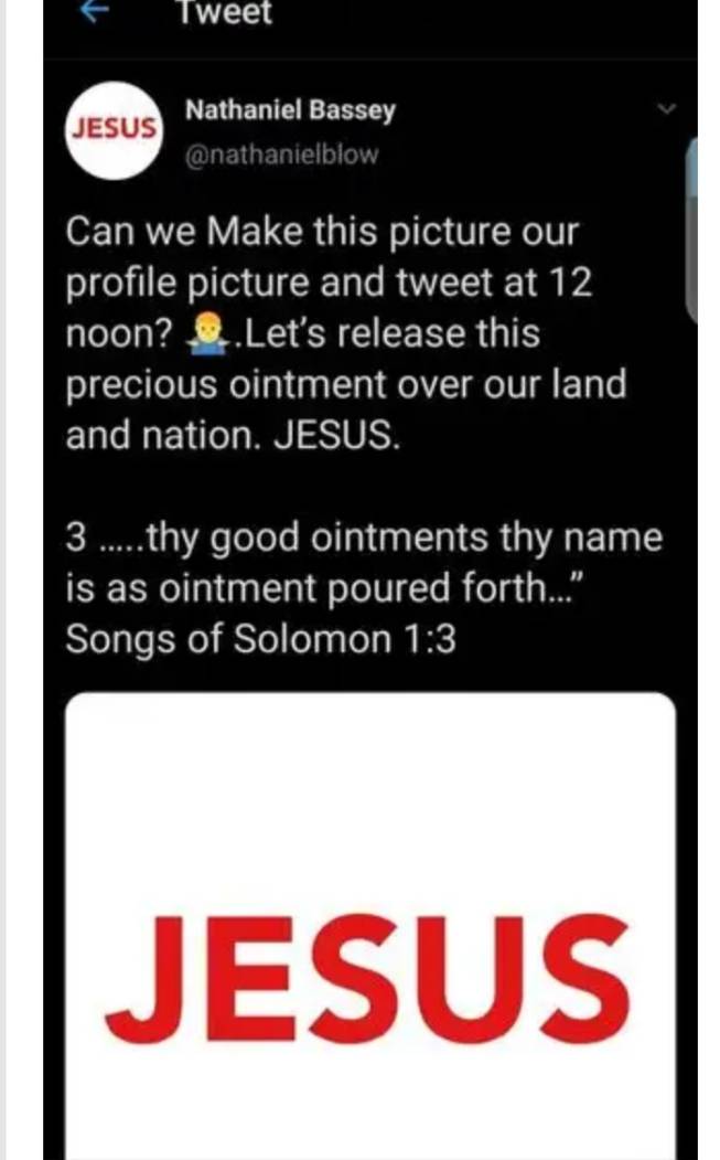 He said "Can we make this picture our profile picture and tweet at 12pm noon? Let's release this precious ointment over land and nation; Jesus".