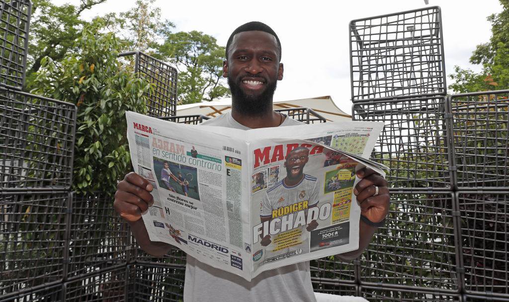 The defender spends half an hour with MARCA, preparing for his presentation on June 20 to introduce himself to Real Madrid fans. Rüdiger commits to deliver his heart every minute he wears white, excited, eager, and accountable for the struggle that lies ahead. He rushes to pick up his new shirt as soon as he notices that the MARCA envoys have delivered it to the German headquarters. He picks it up and poses with it for the June 9 cover illustration.
