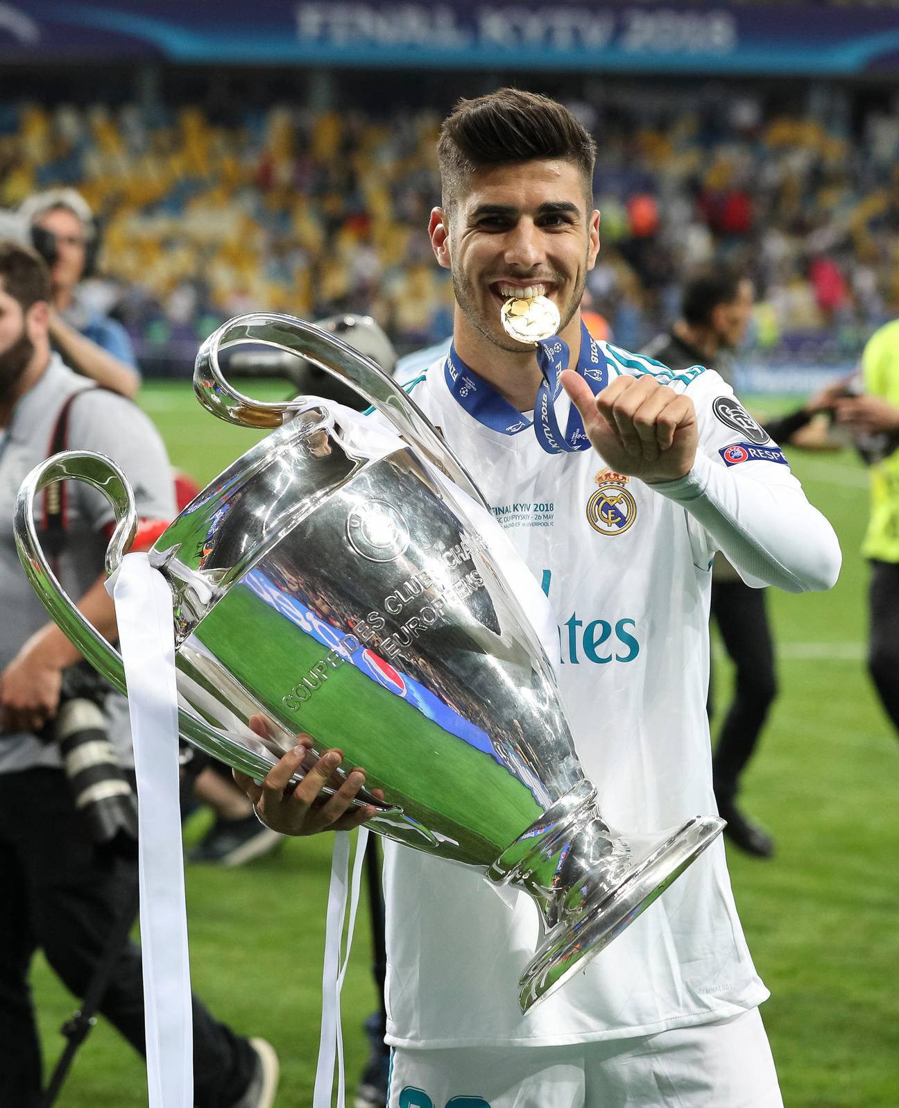 The Champions League trophy is held by Marco Asensio.