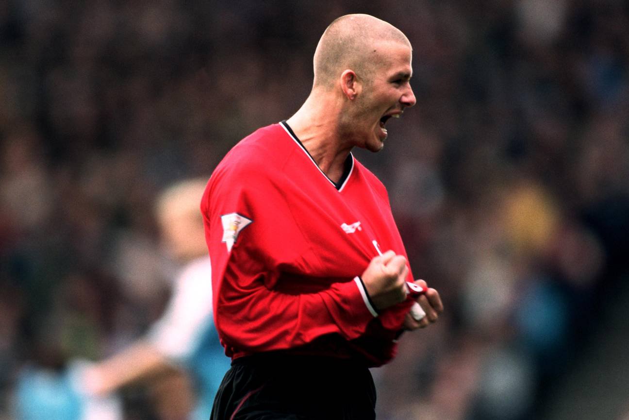In 2000, David Beckham celebrates after scoring a free kick against Manchester City.