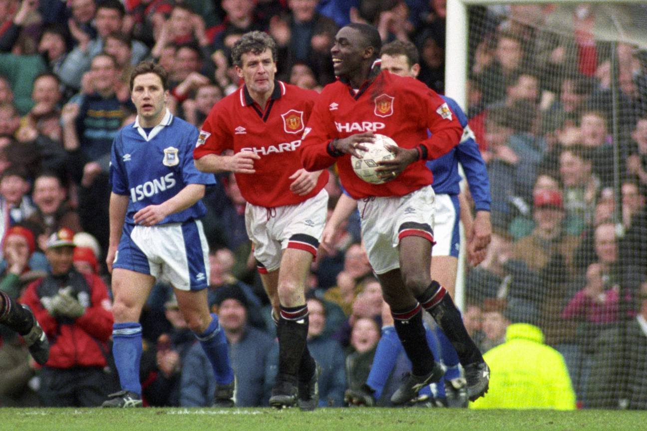 Andy Cole celebrates his hat-trick in a 9-0 thrashing of Ipswich Town.