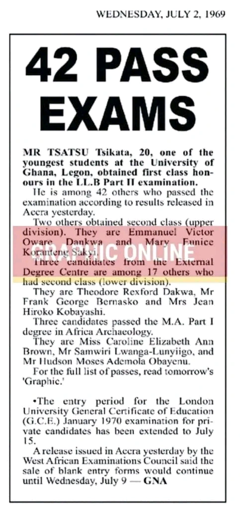 The Graphic Online published a throwback of a well-known occurrence from July 1969 yesterday. Tsatsu Tsikata graduated from the University of Ghana, Legon, in that year with a First Class Honors after clearing the LL. B Part II Examinations. He appears to have been the sole First Class student among the two others. 42 students in total passed, but Tsatsu stood out.