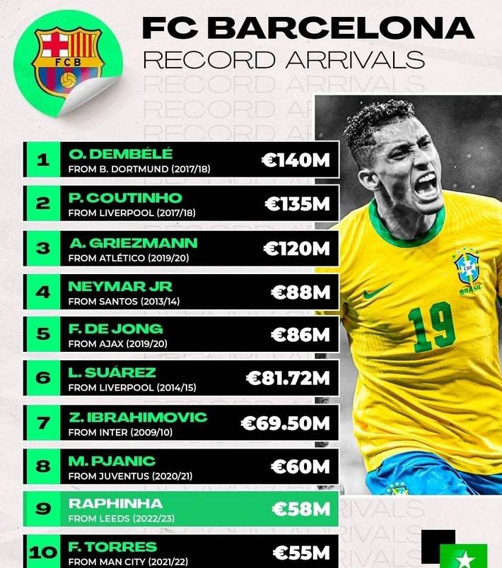Zlatan Ibrahimovic, Miralem Pjanic, and Ferran Torres are among other players who made the top 10 list. However, Barcelona's ability to place second in the 2021/22 La Liga standings was due to Ferran Torres, who joined from Manchester City during that season. Pjanic, who joined Barcelona in a move of 60 million euros with Juventus for the 2020–21 season, fell short of expectations. Do you believe Raphinha will fulfill everyone's expectations in Barcelona?