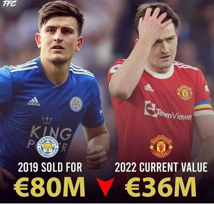 Harry Maguire, an England international, was valued at €80 million in 2019 when he transferred from Leicester City to Manchester United; his current value is now estimated to be €36 million in 2022.