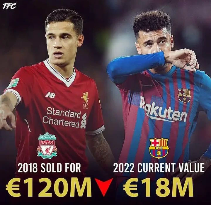 - Brazilian international Philippe Coutinho, whose current value is €18 million in 2022, was valued at €120 million in 2018 when he moved from Liverpool to Barcelona.