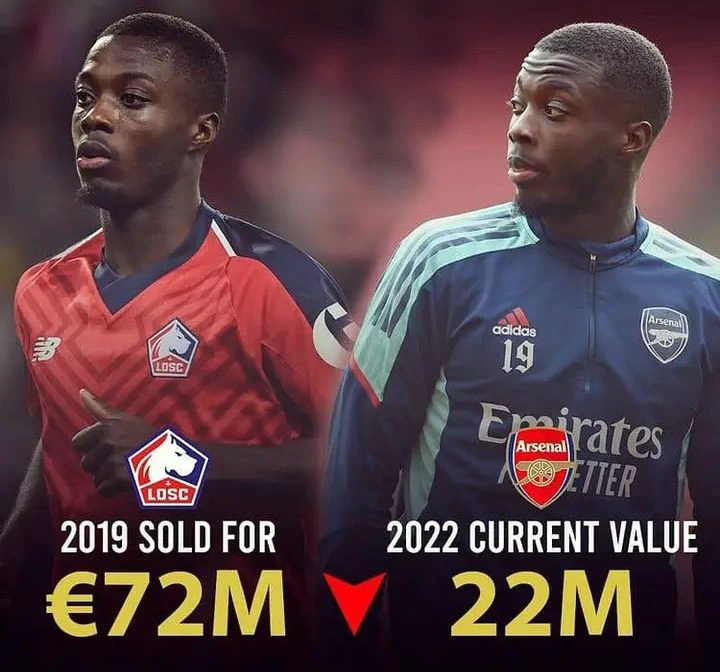 - Nicolas Pepe, an international for Ivory Coast, was transferred from LOSC Lille to Arsenal in 2019 and was valued at €72 million at the time. His value is currently estimated to be €22 million in 2022.