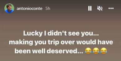 On August 15, Antonio Conte posted a story on Instagram with a video of Thomas Tuchel rushing by him in joy following Chelsea's second goal. "Lucky I didn't see you...making you trip over would have been well deserved," he captioned his story in a hilarious way.