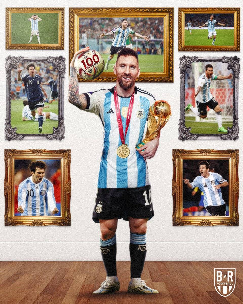 With his goal against Curaçao in the 20th minute on Tuesday, Lionel Messi became the third player in history to score 100 goals for his country, and the first to do so while holding a men's FIFA World Cup trophy.