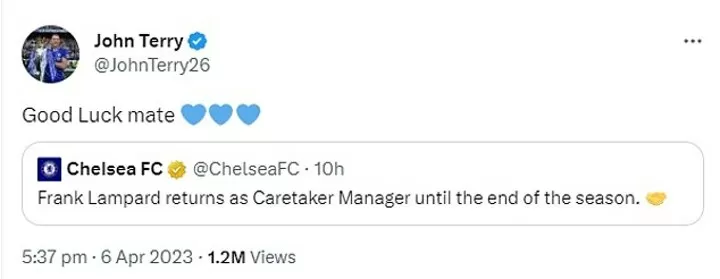 John Terry wishes Lampard well as the latter returns as caretaker boss