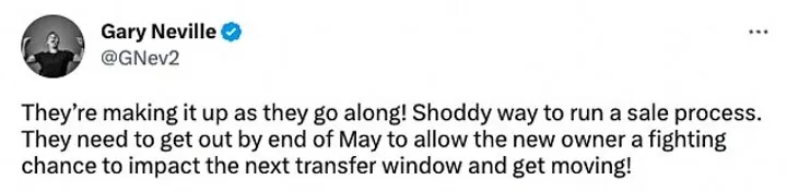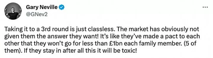 However, the news of another round of bidding infuriated United legend Neville, who urged the Americans to get out of the club as soon as possible.