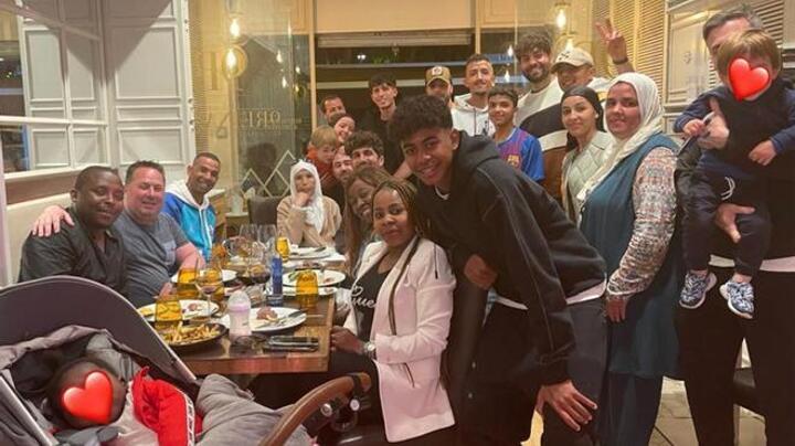 At 15 years of age, Lamine Yamal is living a dream after his first call-up to the FC Barcelona first team. The Juvenil A (U19s) forward sat on the bench for the first time at Spotify Camp Nou on Sunday against Atlético de Madrid and a few hours later he celebrated with his family, as the photo published by the Twitter account 'FCB World' shows.