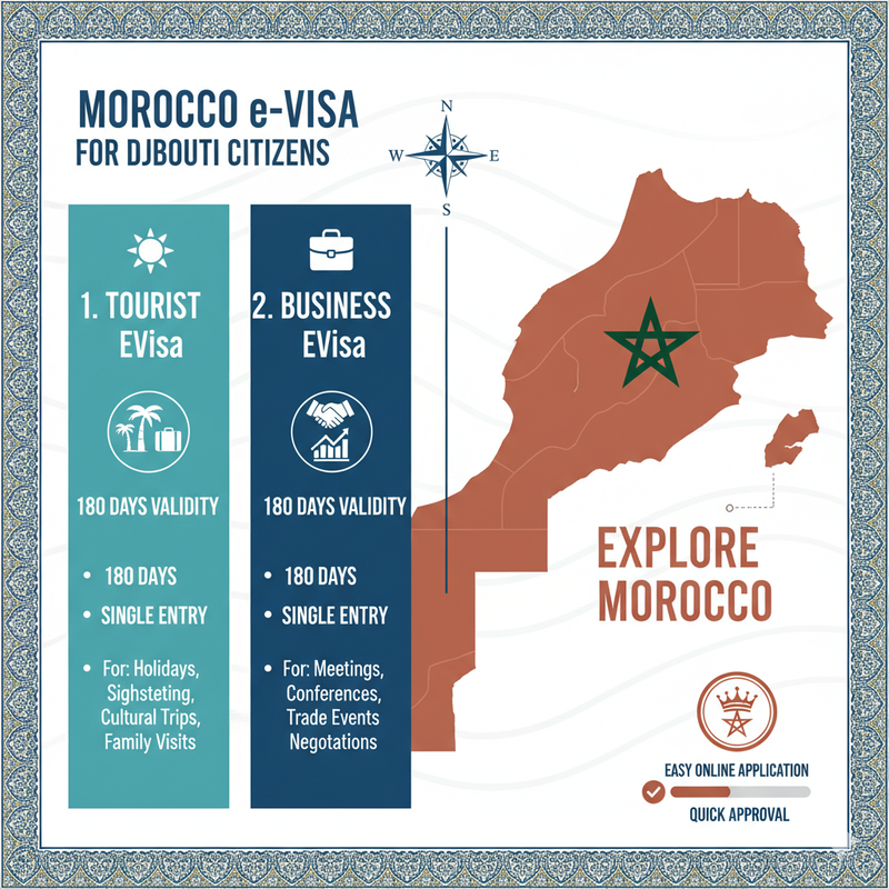 This option is for Djibouti citizens who want to visit Morocco for holidays, sightseeing, cultural trips, short family visits, or general tourism. It allows you to enter Morocco once and stay for a short period within the 180-day validity window.