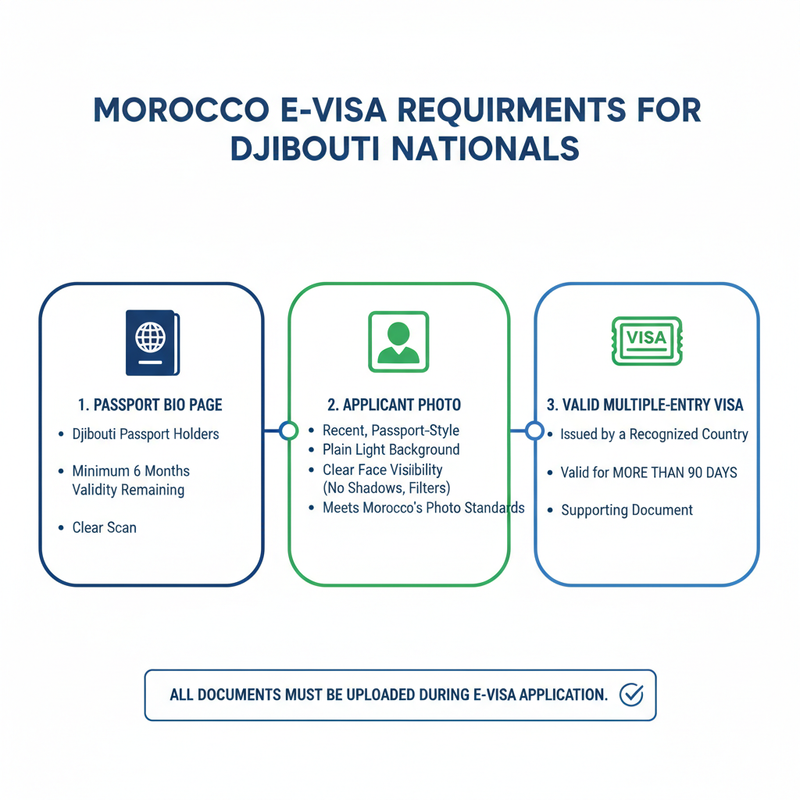 Djibouti nationals must provide a valid multiple-entry visa when applying for the Morocco e-Visa.