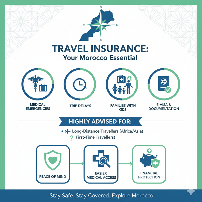 - Travellers entering Morocco with an e-Visa, as insurance strengthens your documentation and adds safety during the trip.