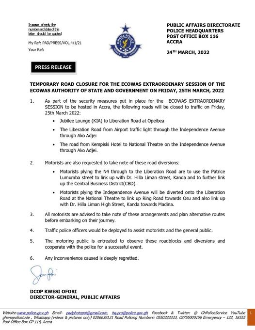 The roads closed to traffic include; “Jubilee Lounge (KIA) to Liberation Road at Opeibea, the Liberation Road from Airport traffic light through the Independence Avenue through Ako Adjei interchange and the road from Kempinski Hotel to National Theatre on the Independence Avenue through Ako Adjei interchange.”